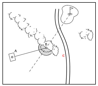 (2)接受罚1杆,在B点左下方不更靠近球洞的虚线上抛球打第4杆。