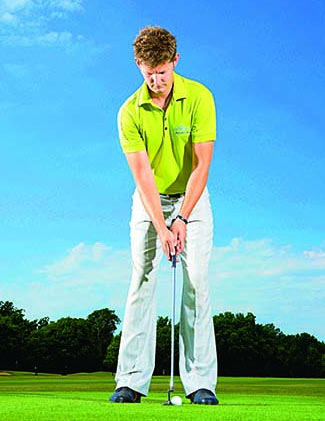 瞄球準备时站位宽度和正常推杆时一样,但站姿稍微挺一些,这能给你较大的空间来摆动双臂,做出较长的推杆动作,让杆头平顺地加速通过触球。