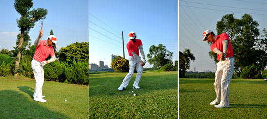 因为希望能将球打更远,所以我们会去做出全上杆动作。但是,如何将启动下杆时所产生的扭力,转化成触球瞬间的杆头速度?方法就是让身体转动,使握着球杆双手以更快的速度移动,而在挥杆圆弧最外围的杆头,才有真正的速度。