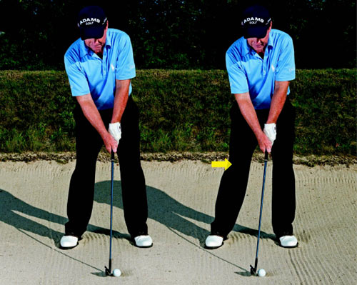 面对球道沙坑时,首先要通过双脚嵌入沙中来稳定站姿。随后,由于双腿向下嵌入沙中,所以握杆要稍短一些。挥杆前,身体稍稍向目标方向倾斜。试着将右膝盖内扣,并保持身体向左倾斜(右图)——这是保证先触球再触沙的秘诀。