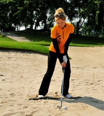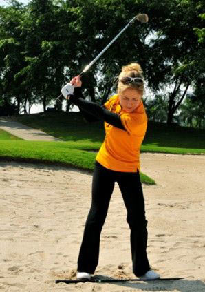 5、顺着沙坑的表面去挥杆,不要企图用杆面去捞球。