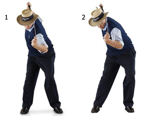 不使用球,如图所示,将一支铁杆置于肩部后方,做出上杆转体。在上杆顶点,观察一下握柄顶端指向地面的什么地方。现在,左髋迅速向着目标移动,杆身不动,仍然指向地面上同样的一点。你马上就会感觉到能量注入了背部和肩部。亲爱的读者,那就是速度的感觉。