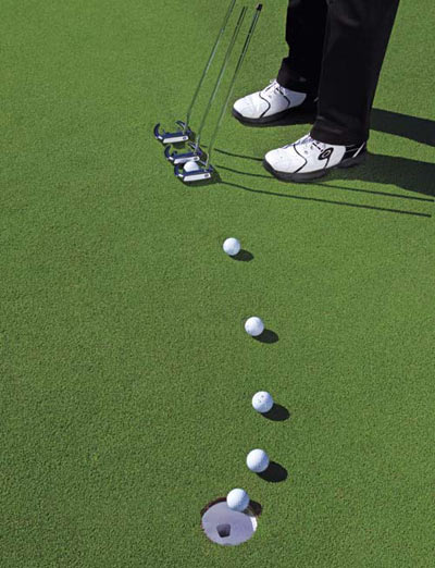 短推(2-6英尺)绝对至关重要。短推失误就相当于面对障碍区救球或宣布不可打之球,你注定要损失杆数。如果你还不了解我们的“短推圈训练法”,可以看看右侧远端图中菲尔·米克尔森的训练方法。在练习果岭上找一块倾斜区域,把10个球放在距离洞杯3英尺处,组成一个圆圈,练习推击,直到能够连续10次推击进洞为止。菲尔每周都要采用几次这种训练法。这样不仅能够练习短推,还能熟悉各种不同的偏移路线。只有纯粹的上坡和下坡推击才会笔直滚向洞杯,其他的推击都会有一定的偏移(下坡推击的偏移幅度大于上坡推击)。