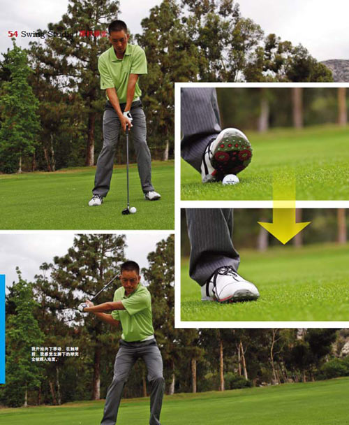 接下来,完成上杆,在下杆时,你需要感受左脚将球踩入地面。这一练习会确保你在触球时将重心转移至身体左侧,这对于实现扎实触球非常重要。如果你的重心保持在右脚(左手球员的左脚),你的挥杆可能过于倚重双手,甚至是上提球杆击球。但如果在下杆中将重心转移至身体左侧,你不仅会挥得更快,同时你会利用身体的大块肌肉群挥杆,从而防止双手的过早释放。