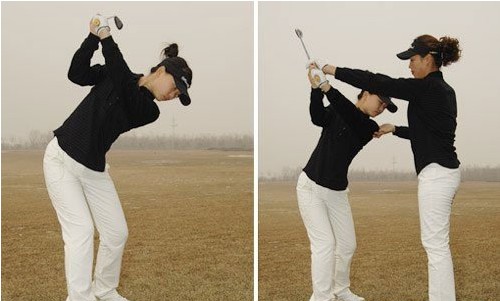 二、上杆右腿抵不住力量 解决方法:站姿的时候,双腿弯曲过大,会导致右腿抵不住力量,所以站姿把关要严。上杆时因为转肩时柔韧性不够,那就用左膝盖抵住客人右膝盖,然后左手扶住客人右肩,右手扶住客人握杆的双手。(引导客人动双肩上杆,以客人能接受的幅度为佳,让客人体会右腿锁住身体轴不变“拧起来的感觉”)。(如图3错误、4)