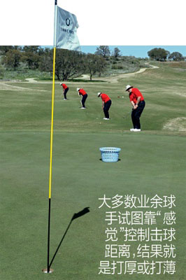 问问你的朋友,他们在150码处的标准球位上会使用什么球杆,看看他们如何回答。我猜他们马上就会说出选择什么球杆和挥杆动作。如果你问的是40码内的击球,我敢打赌他们无法给出明确的答案。他们可能会说“挖起杆”,但他们说不出是哪支挖起杆,也说不出是全挥杆,还是四分之三挥杆,击球力量是大是小,采用什么样的挥杆动作。由于大多数业余球手面对近距离击球时并不确切知道应该选择什么球杆和挥杆动作,他们会试图靠“感觉”控制击球距离,结果就是打厚或使球飞过果岭。