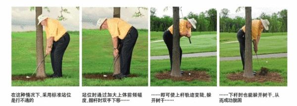 在这种情况下,你可以考虑另外一种打法:仍然采用右手球员的挥杆,但调整站姿,使上体自腰部大幅度前倾,使球对准站位正中后方。握杆时双手下移,站得离球近一点,你自然会使挥杆平面更接近垂直,从而使得球与树干之间的空间足以容纳球杆(如第3张图所示)。