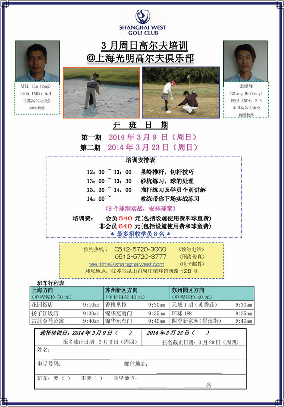 上海光明高尔夫俱乐部3月周日培训安排