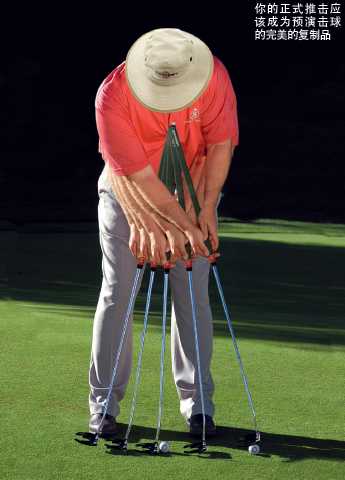 在你的会员球场里,年复一年,你遇到的全挥杆挑战是相同的。因为球道和着陆区域总是固定不变的。但走上果岭时,情况就变了。洞杯位置是不断变动的,每天的风向是不同的,草皮总是处于长高和剪短两种状态之间,季节在更替,果岭速度也在变。在每个果岭上,你很少会在同样的位置上推击。结果是,你面对的每一记推击都是全新的、独特的。要更好地体会每一次新的推击,你可以在正式击球前先试挥,以制造出预演击球。下面是具体做法: