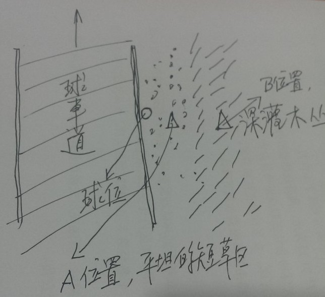 右侧挨着球车道有一片平坦的短草区(A位置),再往右则是一片很深的灌木丛。