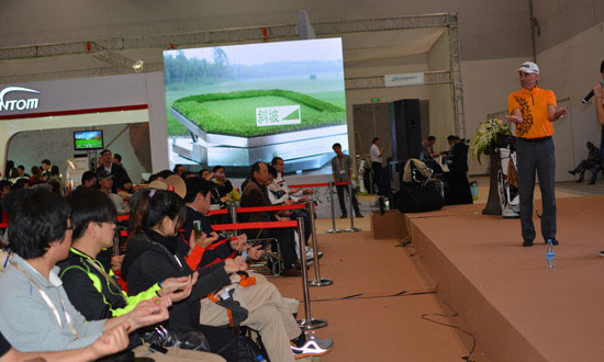 在高博会首日的教学公开课上,丹尼与大家分享了他一直以来所推崇的离心式挥杆理念,丹尼所倡导的离心力的挥杆方式,运用身体为中心轴,通过特定的肌肉群组有效地重复相同的挥杆动作,运用腹肌的力量带动上杆,腿部的力量带动下杆,配合翻转左手腕和投掷右手肘的力量来进行释放。在讲解他的离心力挥杆理论时,丹尼则形象地引用了“烤全鸡”、“抬大米”、“侧脚踢”等易于理解和模仿的动作来表现。系统科学的理论阐述,加上形象生动的比喻,台下的观众听得全神贯注,讲到精彩处,不仅台下观众跃跃欲试地模仿起丹尼的动作,就连舞台四周的观众也都跃跃欲试,全体观众现场做起了整齐划一的动作,场面一时火爆。