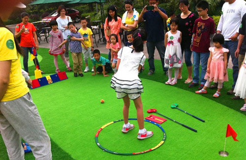 实用的集训环节过后,即来到趣味的亲子高尔夫推杆赛。以家庭为单位,爸爸妈妈和孩子一同上阵,在体验区上各自推杆,以总成绩为计,赢取丰厚的冠、亚、季军奖品。
