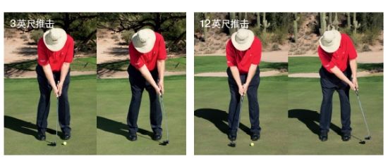 要了解挥杆幅度与推击距离的关系,可以看看我在3、12、36英尺推击时的上杆和顺势动作幅度。3英尺推击时,我只让杆头后移约两三英寸,顺势动作幅度也是如此。12英尺推击时,我会上杆至杆头对准后脚脚尖,收杆时杆头对准前脚脚尖。36英尺推击时,挥杆幅度大大增加了。标准是,每次推击时都采用1-2节奏,挥杆时间保持一致。12英尺与30英尺推击相比,后者的挥杆幅度更大,但我会避免双腕和身体使出更大的力量。我仍然采用1-2节奏,使挥杆时间保持不变。