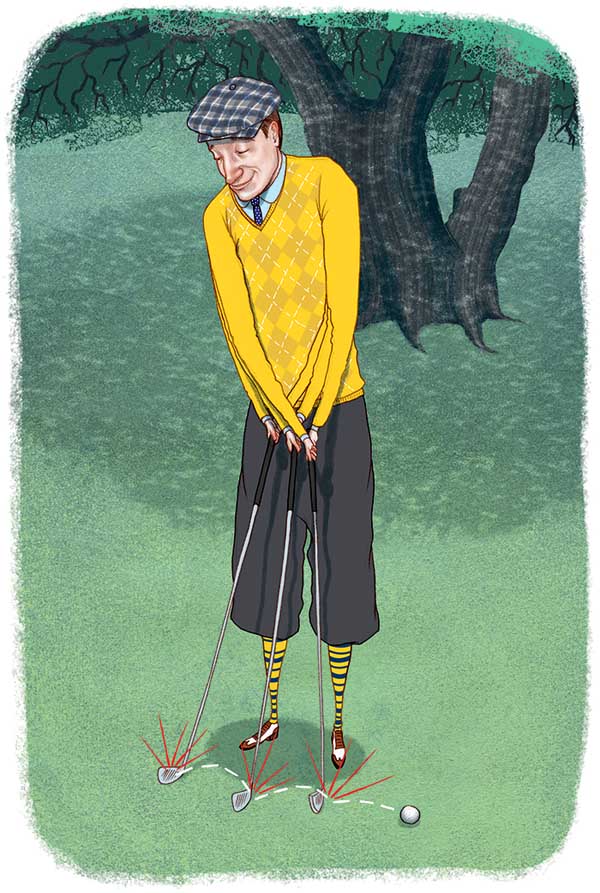 所以,他这次挥杆要计两杆,一杆是最初的击球,一杆是接下来的两次击球。如果你的朋友能够边骑独轮车边做出三连击,他甚至可以去表演杂技呢。