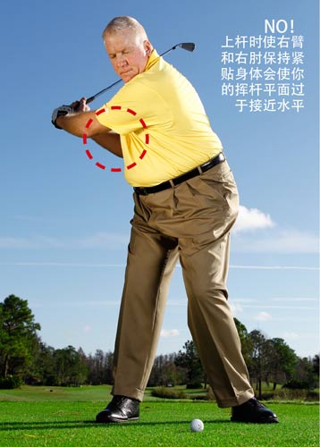 你看到许多球手在挥杆时使右肘靠近身体。但当你试图模仿他们的动作时,你却做得太过分了,使得右肘贴紧身体,导致你无法自由地挥臂。此外,它还会导致挥杆平面过平,减小挥杆弧半径。