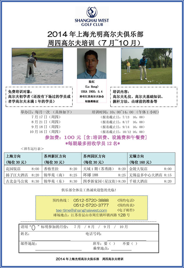 上海光明高尔夫俱乐部(7-10月)周四培训安排