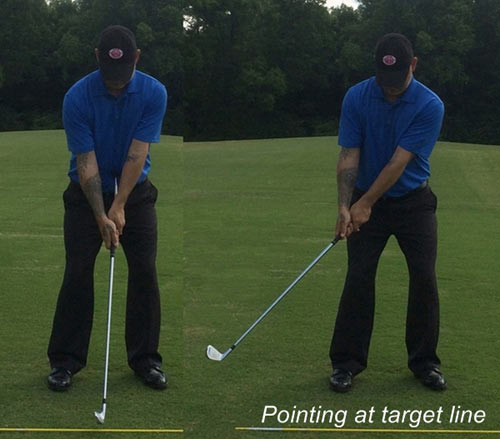 如果你一直都在与上杆作斗争,我建议你尝试以下的训练法。该训练法通过视觉上的“定点”追踪检查,以确保身体动作、手臂位置及球杆之间的协调同步性。只有通过了路径上的那些特定的“点”,才认为是处于正确的挥杆平面上。为了确定球杆是否在挥杆平面上,我们需要在整个后挥过程中观察球杆的指向及是否与目标线平行。