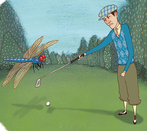 我用推杆去赶蜻蜓,却不小心碰到了球。我的对手马上声明,这种情况要罚一杆。