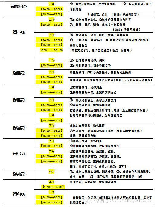 A班(初学班):半封闭授课,7天,对高尔夫有兴趣的初学者,费用含食宿,练习场击球费用,一次下场击球费用,赠送品质球具一套,高尔夫专业服饰一套,俱乐部学习期间意外伤害保险,奥伦达高尔夫俱乐部埃克森高尔夫练习场会员一年,费用:¥12000