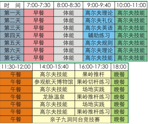 夏令营安排每个工作日上午为高尔夫技术教学时间,期间由中国职业球员亲自授高尔夫技术课程,每个孩子将在愉快、轻松的环境中学习高尔夫运动击球基础,下午击球练习及体验下场打球,在最后一天亲自同台竞技,为保证教学质量,每期营员不找过10人。