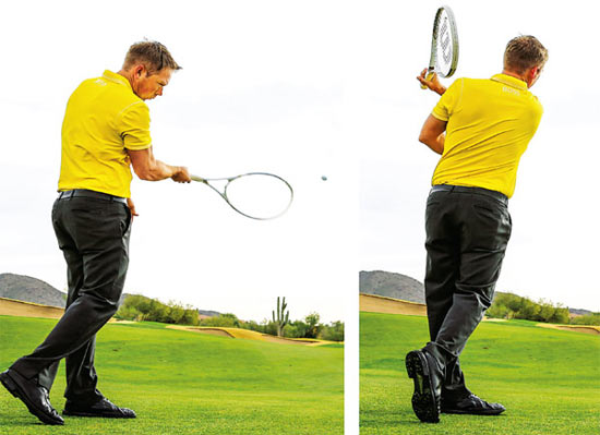 你会开始注意到你的右手肘始终保持贴近体侧,并在下杆时肘尖朝下接近触球。记住,优秀的网球手用全身击球,而不只是双臂,他们通过击球过程中的转体来实现这一点。在高尔夫挥杆时做同样的动作,并且让直觉来接管一切。