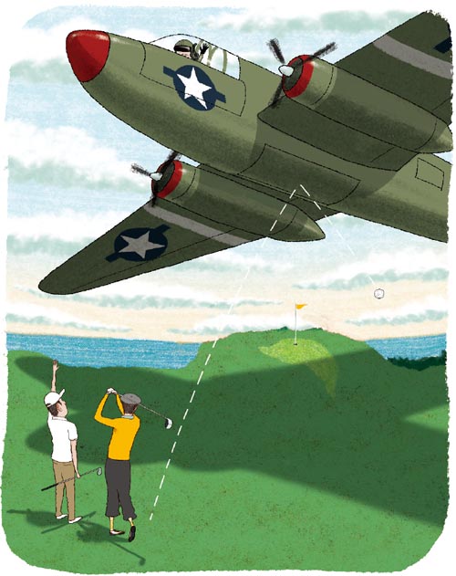 我们在一个军事基地附近的球场打球。我哥哥在一个四杆洞攻果岭时击到了头顶一架飞得很低的飞机,小球被飞机反弹到我们身后100码的地方。