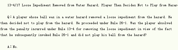 问:一名球员的球位于水障碍,他从障碍区清除散置障碍物。随后,他决定不从障碍区打球,并按照规则26-1来操作。鉴于球员随后调用规则26-1的事实,他清除散置障碍物但没从障碍区打球而产生的规则13-4的处罚会被免除吗?