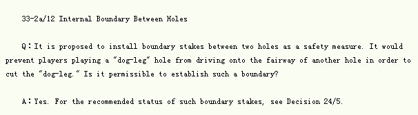 问:出于安全的考量,提出在两个球洞之间安装边界立桩。在打狗腿洞的时候,为了绕过狗腿,这样做会阻止球员们把球发到另一个球道上。建立这样的边界是允许的吗?