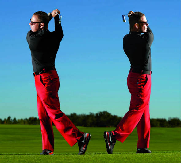 此外,按这种方法训练还能提高肌肉的平衡力,从而避免因为在一个方向上千次挥杆造成的劳损——特别是后背下部。比较理想的办法是,练习时做一些反向挥杆,次数至少达到常规挥杆的一半。