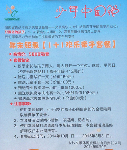 现文景高尔夫俱乐部推出“少年中国强”--【1+1欢乐亲自套餐】,文景高尔夫俱乐部与云集达高尔夫学院共同专注培养小孩的高尔夫运动,只要您的小孩:1、热爱高尔夫运动;2、需要健康体魄与绅士修养,我们愿尽力为您和孩子提供最好的平台支持。