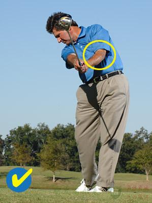 我身边的好几位铁杆和博友,在读了我的学习笔记《20条永存的球技箴言(二)》中的箴言6:为了提高精确度尽量延长触球区 (EXTEND THE IMPACT ZONE FOR ACCURACY)后,按照我笔记忽悠的方法:“在通过触球区后,让杆头继续沿着目标线方向送出去,让杆头(沿着目标方向)再飞一会儿!”(见下图),特别是按照老虎的动作图片,苦练后,谁知好几位都产生了新的更严重的问题 - 香蕉球(右曲球)。