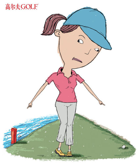 武汉东方球场的第14 洞是一个比较长的三杆洞,很多球员需要用球道木杆进攻果岭。球员姜艳娇开球偏右。发球台右侧以及发球台和果岭之间的右侧区域都有红色立桩作为提示,但果岭右侧及后方却见不到任何红桩,于是球员询问自己的球童:“我是不是要打一颗暂定球?”球童很肯定地回答:“当然需要,果岭右侧和后方是一片树林,那边不是水,你的球有可能不在水里。”因此,姜艳娇自然地打了一颗暂定球。