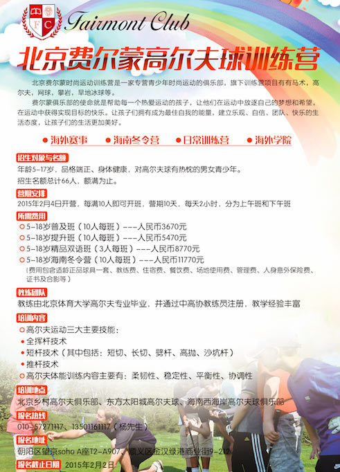 3670元/人 北京费尔蒙青少年高尔夫球训练营