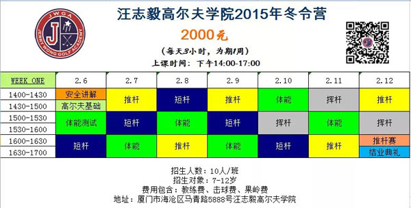 2000元/1周 JWGA高尔夫学院2015青少年冬令营