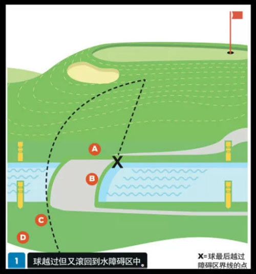 1. C和D点。由黄色画线或立桩标定的水障碍区,不允许球员像侧面水障碍区那样在最后入水点2支球杆范围内抛球,这样可以排除A点(即便是位于侧面水障碍区,A点也是不允许的,因为它比入水点离球洞更近)。在B点也是不允许的,因为不可以在障碍区内抛球(桥被视为障碍区的一部分)。如果你画一条直线,以球洞为起点,穿过球最后进入水障碍区界线的点,然后向远离球洞的方向延伸,C和D点是可以的,因为它们位于线上且不在障碍区内。