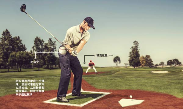 打出扎实有力触球的关键之一,是下杆中将重心移至左侧髋部。这一动作能将力量从你的下半身转移到上半身和双臂(没错,高尔夫挥杆的力量是从地面往上传递)。为了改善你的重心转移,可以参考打棒球的动作。想象自己是站在本垒板的击球手,右髋部是一个棒球。当你从上杆顶点挥杆,在启动下杆时朝第三垒“扔出”棒球(即右髋部)。这将驱动重心移至左髋部,为双手和杆头扫清道路,让你毫无阻碍地以最高速度迅猛通过触球区。