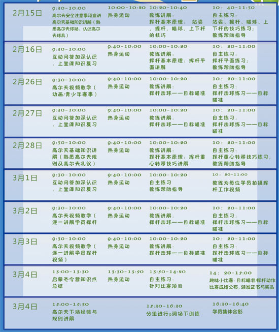 3.本次活动共分10个课时,每个课时时间为2小时,每个课时半天时间。开课期间,我行派专车在分行门口接送学员至高尔夫练习场,沿途会根据路线和人数设置接送站点,客户也可选择自行驾车前往。