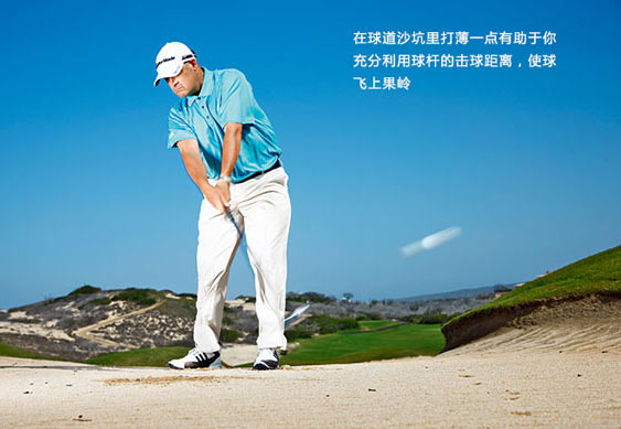 在球道沙坑里,要想达到每一支球杆应有的击球距离,需要先触球后触沙,——恰好与果岭边沙坑球打法相反。这种打法与处理球道上的理想球位时是一样的,但由于大多数业余球手并不擅长在标准击球时削起一块草皮断片,你需要对球道沙坑球进行有针对性的训练。