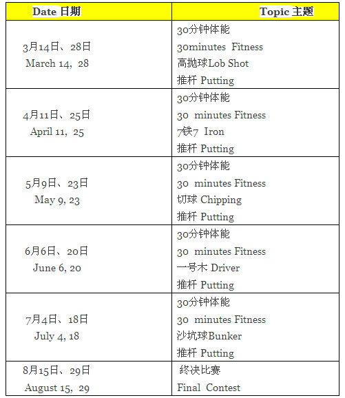 教练带着大家一起去挑战各项高尔夫技能,看谁可争夺到欣荻瑞高尔夫学院青少年活动“冠军王”的头衔!