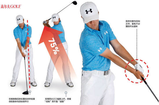 当你的首选开球打法在发球台上失灵,你仍有机会取得低杆数——只要你掌握一种“万能”击球法。我最爱打砸击小右曲开球,这是一种可靠的、无压力开球。开始时,在球道左边缘找一个目标,然后让球杆和身体瞄准它。先从杆面开始,接下来确保双脚、髋部和双肩与目标线平行,而不是开放(这是击球常犯的错误)。一旦摆正预备姿势,就进行关键的两步:将球置于站位间比平常略靠后的地方,架球比平常略低。这两个调整将有助于保持球的低飞和减少侧旋。接下来使用75% 的速度挥杆。相信我,你不需要大力击球,只需要用一个可控制的动作将球送到球道中央。为了进一步提升扎实触球的机会,采用大约四分之三幅度的挥杆。
