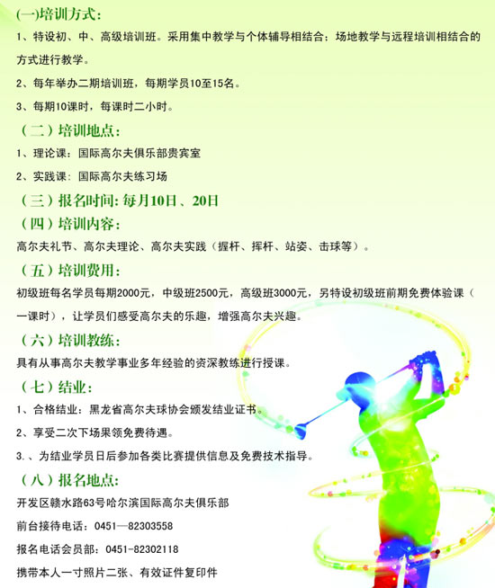 为满足青少年多样化运动需求,黑龙江省高尔夫球协会与哈尔滨国际高尔夫俱乐部联合推出青少年高尔夫培训班,活动期间价格优惠,敬请莅临!
