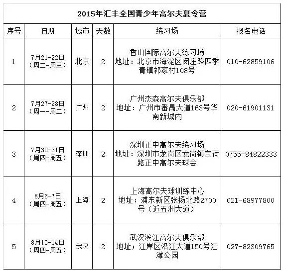 2015年汇丰全国青少年高尔夫夏令营将在全国五个城市开展,旨在进一步向高尔夫零基础的青少年们普及高尔夫运动,享受高尔夫带来的乐趣,让更多的孩子可以有机会与这一项运动亲密接触。