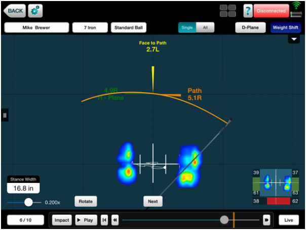 我常用的另外一个高尔夫击球监测分析器是BodiTrak Pressure Mat system,该系统可分析出球手在挥杆过程中重心的转移情况。这有利于揭示出右曲球特征背后的原因。在上杆顶部位置时,重心位于脚趾部位,61%的重量位于左脚,而76%位于右脚。