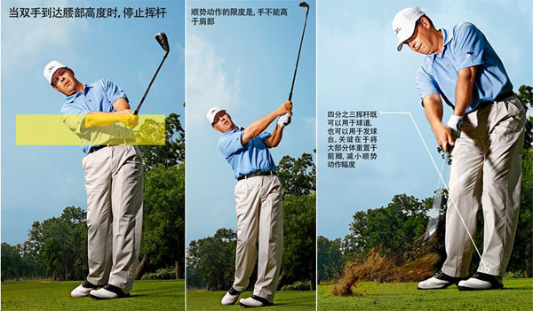 我将要推荐的这种简单的击球类型也是许多巡回赛球员在比赛压力下的选择。有些教练称其为控制击球,我则喜欢称其为稍低于标准弹道的四分之三挥杆。掌握了这种打法以后,你可以在球场上任何地方使用它,包括发球台。因为它会比标准击球飞得更直,更可靠,更容易预判结果。此外,四分之三挥杆的技术还能让你体会到稳固的铁杆挥杆所需的基本技术的感觉,帮助你在找不到铁杆击球感觉时重整旗鼓。