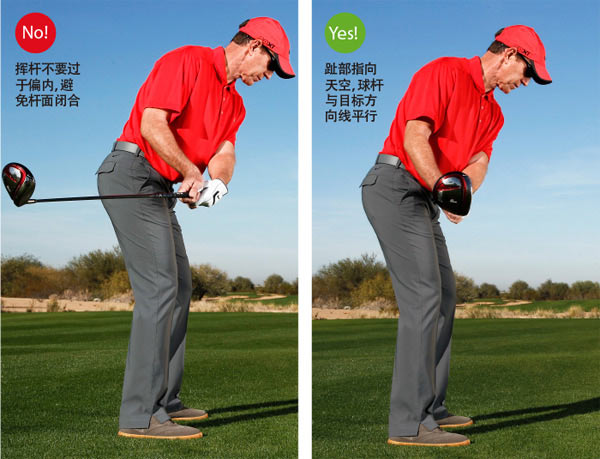 解决杆面闭合很容易。上杆时,让双臂将杆面转至开放。当球杆与腰部同高时,趾部应指向天空。杆面开放幅度不要超过这个标准,否则就可能打出右曲球。同时,上杆时注意观察杆头与双手的相对位置。很多业余球手在试图将杆面转至开放时,会向内甩动杆头。正确做法是,使趾部指向天空,使球杆与目标方向线平行。