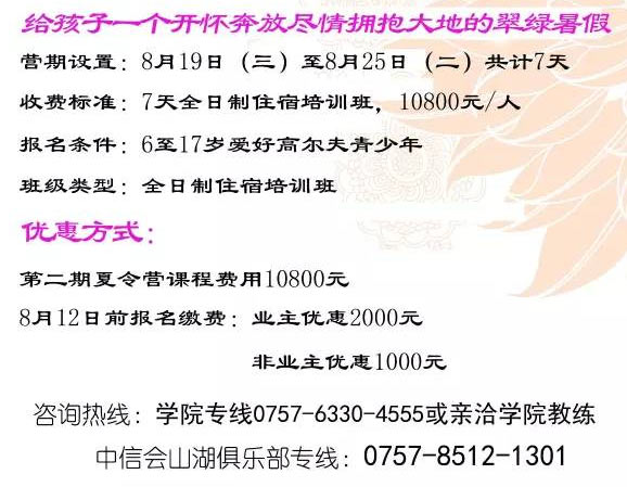 10800元/7天 第十三届中信山语湖高尔夫学院夏令营