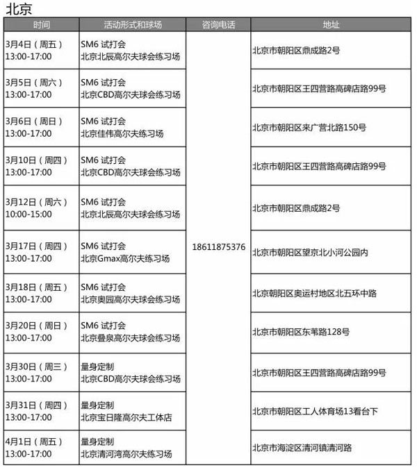 感谢您对 Titleist 产品的支持,以下是我们2016年3月份各地区的 SM6 新杆试打体验活动、量身定制及高球优选活动安排,快来预约参与 Titleist 的活动吧!