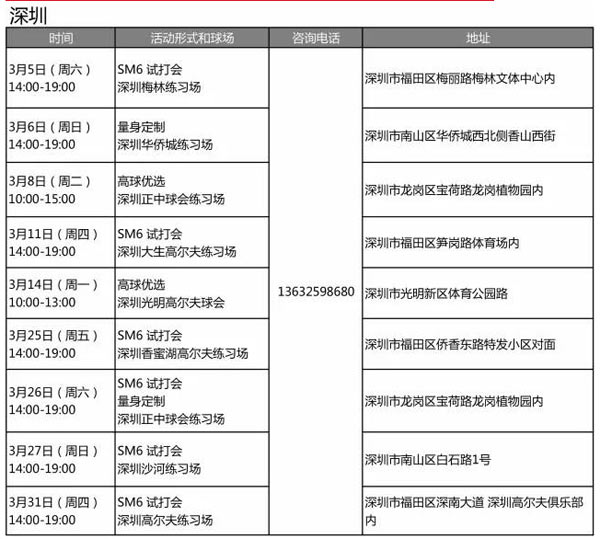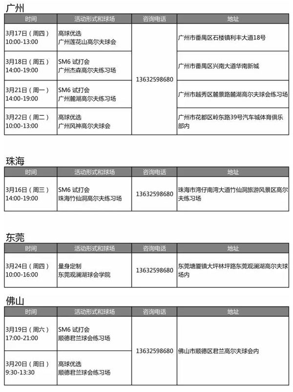 感谢您对 Titleist 产品的支持,以下是我们2016年3月份各地区的 SM6 新杆试打体验活动、量身定制及高球优选活动安排,快来预约参与 Titleist 的活动吧!