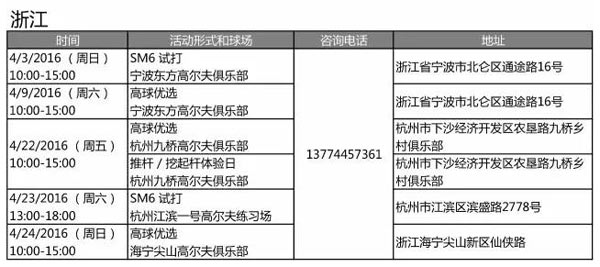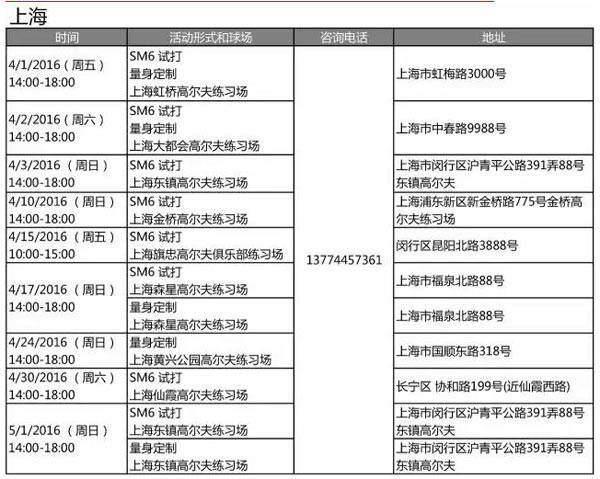 感谢您对 Titleist 产品的支持,以下是我们2016年4月份各地区的 SM6 新杆试打体验活动、量身定制及高球优选活动安排,快来预约参与 Titleist 的活动吧!