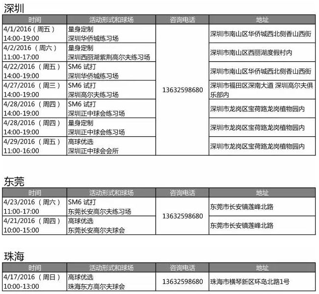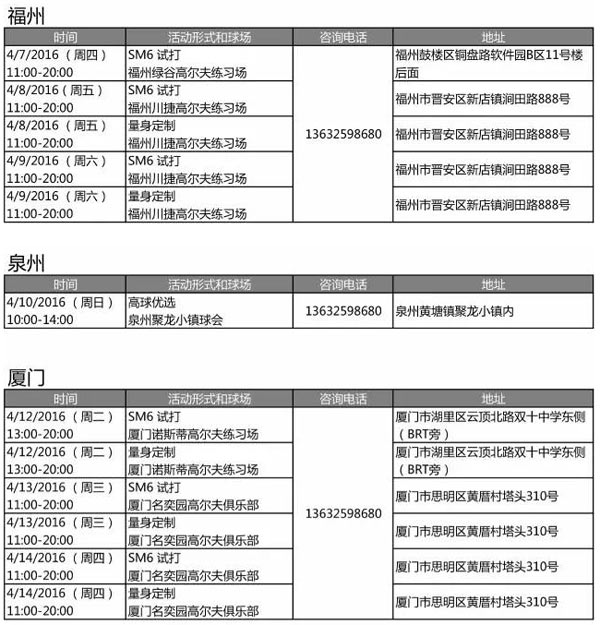感谢您对 Titleist 产品的支持,以下是我们2016年4月份各地区的 SM6 新杆试打体验活动、量身定制及高球优选活动安排,快来预约参与 Titleist 的活动吧!
